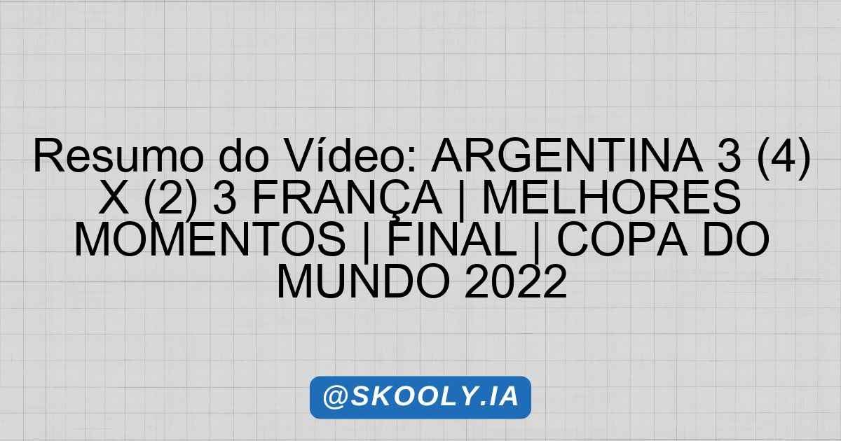 O vídeo “ARGENTINA 3 (4) X (2) 3 FRANÇA | MELHORES MOMENTOS | FINAL | COPA DO MUNDO 2022” do canal CazéTV apresenta os melhores momentos da emocionante final da Copa do Mundo de 2022, onde Argentina e França disputaram um dos jogos mais memoráveis da história do futebol. A partida, realizada no dia 18 de dezembro de 2022, terminou com a Argentina se consagrando campeã após uma disputa de pênaltis.